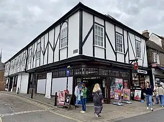 The current moot hall, further to the south in the Market Place, was designed in the Tudor style using timber frame construction, and was completed around 1570.[9][10] The design of the new building involved an asymmetrical main frontage of three bays facing onto the Market Place with a side elevation of eight bays stretching down Upper Dagnall Street. The first floor involved extensive use of jettied timber framing allowing the creation of extra space for the meeting room on that floor. A series of sash windows were installed on the first floor in the 18th century. Internally, the principal room was a long meeting room on the first floor known as the "town hall"; to the east of the meeting room i.e. at the front of the building was the jury room and to the west of the meeting room i.e. at the back was the council chamber. On the ground floor, there was a couple of rooms to accommodate the keeper, some stables for horses and a lock-up for incarcerating petty criminals.[9]