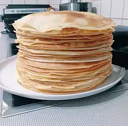 Bliny (pancakes)[5] were a favorite dish of Mordovians.[1][2] They were called pachat and were made from rye, wheat, millet and pea flour.[2] Traditionally Mordovians liked the pancakes to be rather thick and added boiled potatoes into the dough.[2] Such pancakes were served with milk and honey.[2]