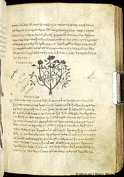 The Morgan Dioscurides (Pierpont Morgan Library, MS M. 652) is a 10th-century Byzantine illuminated copy of the De Materia Medica by the Greek physician Dioscurides, which covers the medical use of herbs and other natural resources and is widely regarded as the most comprehensive collection of naturally occurring resources (plants, animals etc.) and their medical uses. Today, it is regarded as an early, fairly accurate, form of pharmacological text,[1] in herbal form.