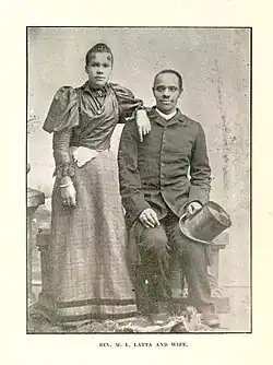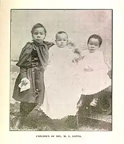 Latta procured a license to marry Eliza Evans on February 7, 1885.[47] It remains unclear what transpired, as a year later he married student Laura Bivens.[48] Records indicate that they lived together in Oberlin Village from 1889 through 1929.[49] They had ten children, Marie Latta, Morgan L. Latta Jr., James L. Latta, Laura Latta, Moses Latta, Jessie Latta, Nellie Latta, Zacharia Latta, Clementine Latta, and Ediith Latta.[50][51][52]|