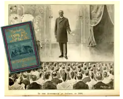 In the book, Latta fabricated stories of traveling to Europe and consorting with Queen Victoria,[43] who he claimed pledged to grant him an entire province if he requested it.[22] Julian Street describes multiple photographs as "made-up", such as the illustration above of him speaking "in the Auditorium at London."[44] During a 1908 insurance trial, Latta admitted that these speaking engagement images were taken at a Philadelphia photography studio.[22]