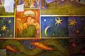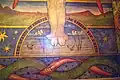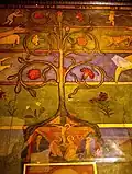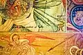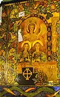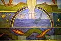 Although the old hospital site had been acquired by the Royal Infirmary of Edinburgh the murals were at risk of slow destruction as the chapel was no longer being used. Then, thanks to a petition led by Traquair herself, in 1894 some of the murals were successfully transported to a new purpose-built mortuary chapel.[5] There were significant technical and logistical difficulties; indeed some of the panels were moved and installed still attached to the bricks of the old building.[2][10] As the new mortuary was larger than the original, panels from the first scheme were repaired, surrounded with fresh plaster, and the spaces filled with an enlarged decoration scheme. Although the two schemes are united by their use of colour, the second scheme deliberately uses a simpler and more childlike manner.[2][7]