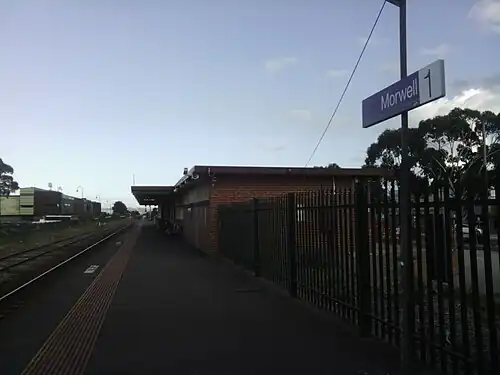 Morwell railway station is a regional railway station on the Gippsland line, part of the Victorian railway network. It serves the town of Morwell, in Victoria, Australia. Morwell station is a ground level unstaffed station, featuring one side platform. It opened on 1 June 1877.[1][2]