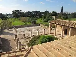 The mosaic was discovered during roadworks in late November 1960,[2] when Tunisian workers widening the road between La Malga and the presidential palace of Carthage[3] uncovered a large structure at the foot of the Hill of Juno. Historian Gilbert Charles-Picard referred to this structure as a "palace" due to its extensive mosaics.[4] The building, located a few meters downhill from another structure with columns, was in a deteriorated condition.[5]