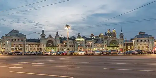Belorussky railway station (Russian: Белору́сский вокза́л, IPA: [bʲɪɫɐˈruskʲɪj vɐɡˈzaɫ]) also referred to as Moscow–Passenger–Smolenskaya[1] (Russian: Москва́-Пассажирская-Смоле́нская, lit. 'Moskva-Smolenskaya'), Informally the whole station can be called as Moscow Belorusskaya (Russian: Москва Белорусская, lit. 'Moskva Belorusskaya'),[2] is a railway terminal of the Moscow Railway[3] located at the front of Tverskaya Zastava Square in Central Administrative Okrug, Moscow. The station is one of nine railway terminals of Moscow. It was opened in 1870 and rebuilt in its current form in 1907–1912.