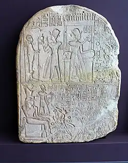 Mose was a Soldier of Ramesses II, beloved of Atum and greatly favored by him. A stele was created for Mose, depicting him receiving gifts from his king. The stela is now in the Roemer- und Pelizaeus-Museum Hildesheim (nr 374) and originally comes from Qantir.[1] The Stele demonstrate his high position: Mose is standing in front of the Pharaoh where the inscription says: "The King himself gives silver and all good things of the king's house, because the king is "pleased with the speech of his mouth". To the soldiers Ramesses says: "I wish you may see and do what His Majesty loves. How good is what he has done! Great, great!".[2]