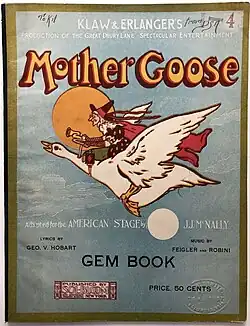 Front cover to sheet music for Mother Goose. This Little Gem Book was published in 1904 and contained new music by Robert Fiegler and L. Robini.[1] Their music was not in the original stage production;[2] although it did use George V. Hobart's lyrics.[1]