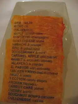 The menu at Moto changed frequently.[2] A typical ten- to twenty-course tasting menu at Moto began with an edible menu. Often, guests would be encouraged to crunch the menu itself up and add it to a bowl of gazpacho to create "alphabet soup."[3] One of the restaurant's hallmarks was the use of edible paper. The soy- and cornstarch-based parchment with vegetable juice as ink was typically used in two to three courses each night. Often an edible photograph accompanied a dish, such as a photo of a cow flavored to taste like filet mignon.[3] Explaining his use of the paper in 2005, Cantu remarked "Gastronomy has to catch up to the evolution in technology" and said he was attempting to change preconceived notions of what food is.[3] Moto customers are "sick and tired of steak and eggs", he said. "They're tired of just going to a restaurant, having food placed on the table, having it cleared, and there's no more mental input into it other than the basic needs of a caveman, just eat and nourish ... there's so much more we can do."[3]