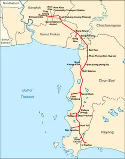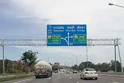 The Bangkok−Ban Chang Motorway (Thai: ทางหลวงพิเศษกรุงเทพมหานคร−บ้านฉาง, RTGSThangluang Phiset Krung Thep Maha Nakhon−Ban Chang), designated Motorway Route 7, is a motorway in Thailand, connecting Bangkok to Chonburi, Pattaya, and Map Ta Phut. The country's first intercity motorway, it is part of the Asian Highway Network as AH Route 19 and AH Route 123. The entire length from Bangkok to Pattaya is 125.865 kilometres (78.209 mi) and the posted speed limit is 120 kilometres per hour (75 mph), enforced primarily by speed cameras. An extension between Pong and Map Ta Phut opened in May 2020.[1] It is part of the transport network development project in the eastern seaboard.