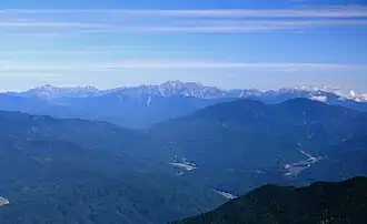Mt. Hachimori (center right). Misogawa Dam, which is at the top of the main stream of the Kiso River, can be seen below Mt. Hachimori.