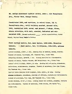From the time of its founding in 1886 until 1935, membership in Mt. Moriah grew. “Soon the Ambroses' home could no longer accommodate the number of people attending the church. So, until the church had a building of its own, it held meetings on alternate Sundays at the Winter Park Town Hall".[2] On March 16, 1888, the trustees of Mt. Moriah purchased lots one and three of block 70 from the Winter Park Company for a church site. These lots, located on the southwest corner of West Lyman and Pennsylvania Avenues, are the home of two church buildings. “On April 26, 1912, Mt. Moriah Baptist Church also purchased for $165.00 from Charles and Helen Morse of Chicago, Illinois Lot Thirteen in Block Sixty-nine to locate a parsonage on West Comstock Avenue".[1]