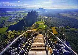Mount Taung Wine (literally translates to 'round mountain', တောင်ဝိုင်း) is a mountain in Myanmar. It is located to the east of Hpa-An, Kayin State. The top of Taung Wine is 313 metres (1027 ft) above sea level. At the summit of Taung Wine Hill, Lawkawidu Pagoda (လောကဝိဓူစေတီ) marks the top. Taung Wine is a tourist destination and famous for its views and natural environment.[1][3][4] After passing through 3 scenic spots while climbing, there is a steel stairway that has a slight resemblance to the Haiku Stairs in Hawaii, that goes up to the top of the mountain.[5][6][7][8]