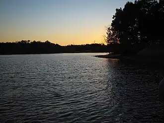 Mountain Island Lake is a lake northwest of Charlotte, North Carolina created in 1924 to coincide with the building of Mountain Island Hydroelectric Station. It is named after the mountain which appears as an island in the lake, and the surrounding area is identified by the lake's name. The shape of the lake follows the meander of the Catawba River's course, dammed near the Mount Holly Wastewater Plant. Full pond elevation is approximately 647.5 feet (197 m). The lake has around 3,281 acres (13 km2) of surface area and 61 miles (98 km) of shoreline.