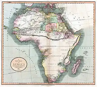 In 1798, a map resulting from the explorations of the area by Mungo Park[2] showed this west-to-east mountain range for the first time. It was produced by the English cartographer James Rennell,[1] who showed the Niger evaporating inland at Wangara.[2] This range was intended to support his own theory on the course of the Niger River, and eventually led to a major impact on the mapping industry to include the mountains. In 1802, Aaron Arrowsmith released a map that included the Mountains of Kong as a main physical geographic feature of western Africa, which encouraged other publishers to update their maps to match.[3]