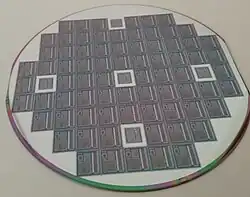 A wafer consisting of MPC designs all over the wafer and five process control monitor (PCM) designs for ensuring good quality of the processing