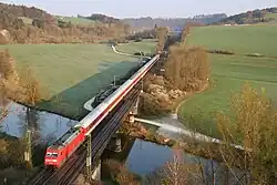 As part of the upgrade, the section from Rohrbach to Ingolstadt was upgraded for 160 km/h from spring 2000 to December 2006.[24] From 1999 to 2001, another bridge was built over the Danube for the construction of a third track between Ingolstadt Hauptbahnhof and Ingolstadt Nord station. The symbolic start of construction for the expansion of the Ingolstadt–Petershausen section was celebrated on 18 June 2010.[16] Line improvements of 7.95 kilometres were planned, along with 5.15 kilometres of new earthworks and the required widening of cross-sections. Completion of the overall project, which included 20 construction phases, was planned for 2014.[25] A total of around €200 million of Deutsche Bahn's own funds[16] would be invested in both sections. Without the upgrade, Deutsche Bahn would have to pay back EU funds for the entire project.[26] In the course of this work, Reichertshofen station was rebuilt about 500 m north of the previous location as Baar-Ebenhausen station.[27] The new station went into operation in July 2011 along with a new section of line.[28] In contrast to the old Reichertshofen station, all the main tracks in the new station are continuous.[29] The number of sidings at the existing station is to remain unchanged.[30]