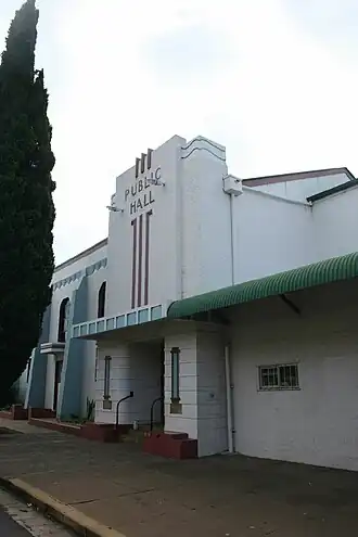 The Murgon complex displays the principal features of these civic buildings, combining a public hall, library (now offices) shops and a clock tower. Like other town hall complexes, it is the focal point of the community and is located near the centre of the town on the corner of Murgon's principal streets.[1]