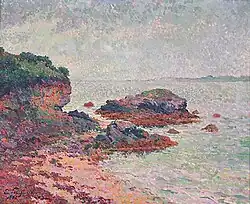 The collection includes the works of Breton painters themselves and artists attracted by the landscapes and peasantry of Brittany in the late 19th and 20th centuries, such as the Nabis painters of the School of Pont-Aven. Among these painters, one will find exhibited at the museum: Évariste-Vital Luminais, Eugène Boudin (including Noces à Quimper in 1857, work acquired in 2012), James Abbott McNeill Whistler (La Côte de Bretagne), Paul Gauguin, Paul Sérusier, Émile Bernard, Georges Lacombe, Maximilien Luce (Côte rocheuse, 1893), Maxime Maufra, Charles Camoin, Paul Ranson, Meyer de Haan or, again, Félix Vallotton, Maurice Denis and Albert Marquet. The museum also has works by other major artists of the 19th century like Théodore Chassériau or Camille Corot.