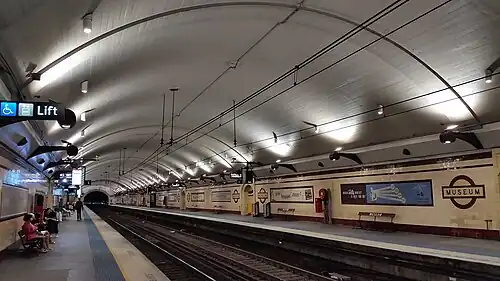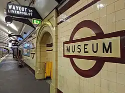 Designed by John Bradfield in the Inter-War Stripped Classical architectural style,[1] the station comprises two platforms, each 158.5 metres (520 ft) long by 3.8 metres (12 ft) wide, under an arch with span 14.6 metres (48 ft). Museum's signage and cream tiling with maroon highlights are reminiscent of a typical London Underground tube station of the era, however its layout of central tracks under a grand arch are more in keeping with older stations of the Paris Métro. Until the construction of the Airport Line in the 1990s, it was the only underground station in Sydney without an island platform. It is a companion to St James station, both opened at the same time and use a roundel design on their station signage that is similar to the one used on the London Underground. The station opened on 20 December 1926 with the opening of the eastern city line from Central to St James.[1][10][11] It became part of the City Circle loop on 22 January 1956.