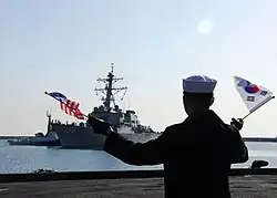The Mutual Defense Treaty between the United States and the Republic of Korea (Korean: 대한민국과 미합중국간의 상호방위조약) is a treaty between South Korea and the United States signed on October 1, 1953, two months after the signing of the Korean Armistice Agreement which brought a halt to the fighting in the Korean War.[1] The agreement commits the two countries to provide mutual aid if either faces external armed attack and allows the United States to station military forces in South Korea in consultation with the South Korean government.[2]