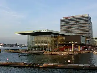 Muziekgebouw aan 't IJ (English: "Music Building on the IJ") is the main concert hall for contemporary classical music on the IJ in Amsterdam, Netherlands. The building opened in 2005 and is located above the IJtunnel, a ten-minute walk from Amsterdam Centraal station. The building was designed by Danish architects 3XN. The Bimhuis is part of and partly integrated in the Muziekgebouw aan 't IJ.