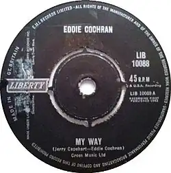 "My Way" was written by Eddie Cochran and Jerry Capehart. It was released posthumously as a 45 single in April 1963 in the UK as LIB 10088 on Liberty Records/E.M.I. backed with "Rock 'N' Roll Blues".[3] The single reached number 23 on the UK singles chart in a ten-week run. The song was recorded on January 17, 1959. The single was also released in Germany, Sweden, and the Netherlands.