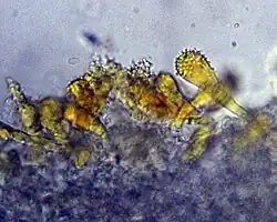 The spores are elliptic, smooth, and amyloid, with dimensions of 7–9 by 4–5 μm.[13] The basidia (spore-bearing cells of the hymenium) are club-shaped, four-spored, and measure 25–32 by 5.5–7 μm.[14] Pleurocystidia and cheilocystidia (cystidia on the gill faces and edges, respectively) are abundant and similar in morphology: club-shaped to somewhat capitate (with a head),[13] the tops sparsely to densely covered with small spines (said to resemble a mace),[18] filled with a bright orange pigment, and measuring 28–36 by 7–12 μm. The flesh of the cap is covered with a cuticle, on the surface of which are found scattered cystidia similar to those on the gills. Directly beneath the cuticle is a layer of enlarged cells, and beneath this are filamentous hyphae.[13] Clamp connections are present in the hyphae.[14]