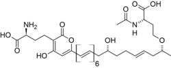 In 2010, a pigment compound isolated and characterized from fruit bodies of Mycena aurantiomarginata was reported as new to science by Robert Jaeger and Peter Spiteller in the Journal of Natural Products. The chemical, mycenaaurin A, is a polyene compound that consists of a tridecaketide (i.e., 13 adjacent methylene bridge and carbonyl functional groups with two amino acid moieties on either end of the molecule). The authors posit that the flanking amino acid groups are probably derived biosynthetically from S-Adenosyl methionine. The tridecaketide itself contains an alpha-pyrone, a conjugated hexaene, and a single alkenyl moiety. Jaeger and Spiteller suggest that mycenaaurin A might function as a defense compound, since it exhibits antibacterial activity against the Gram-positive bacterium Bacillus pumilus. The chemical is only present in the fruit bodies, and not in the colorless mycelia.[29] An earlier screening for antimicrobial activity in the fruit bodies revealed a weak ability to inhibit the growth of the fungi Candida albicans and Aspergillus fumigatus.[30]