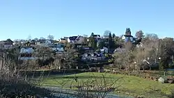 The part of the hamlet area east of the Huntsman's Hotel and north of the Usk Road (B4235) is included in the Wye Valley National Landscape, an Area of Outstanding Natural Beauty. The whole area is classed as a Special Landscape Area.[5] It includes Whitemill Common and Roughets Wood which are separated by Mounton Brook; they had been planted with spruce, larch and poplar from the mid-20th century. As part of continuing environmental improvement plans, many conifers were removed from 1995 and replaced with broadleaved species. Poplars were removed from the inventoried ancient woodland of the lower valley of Roughets Wood in 1999 (part of Whitemill Common by Mounton Brook is also in the inventory) and non-native or invasive species such as cherry laurel and Himalayan balsam cleared or managed. The riverside environment is now native again and semi-natural, containing species associated with ancient woodlands, including wood-sorrel, bluebells, primroses and pendulous sedge.[6]