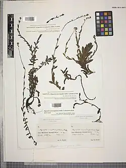 The possible holotype of M. saurwagedica was likely destroyed, along with many other herbarium specimens, during World War II.[8][2][4] A neotype (BM 001252104)[9] and an isoneotype (BM 001252013),[10] collected by Keysser in the same mountains in 1913, were designated by Heidi Meudt and colleagues.[2] They are lodged at the herbarium of the Natural History Museum.[2][3][11]