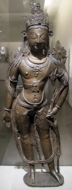 The epithets sahasra-bāhu ('thousand-armed') or sahasra-bhuja ('thousand-handed') commonly appear in Indian literature from the Ṛgveda onwards applied to various personages (e.g. Kartavirya Arjuna), including the gods Shiva and Vishnu.[39] It has been suggested that the thousand arms of Avalokiteśvara is another example of an attribute of Shiva being assimilated into the bodhisattva, with the thousand arms being a symbol of the victory of Avalokiteśvara (and Buddhism) over Shiva, whose name 'Īśvara' he appropriates, and his cult.[42] (Cf. Trailokyavijaya, one of the five Wisdom Kings, depicted as trampling on Maheśvara - the Buddhist version of Shiva - and his consort.[43][42]) The thousand-armed Avalokiteśvara's eleven heads, meanwhile, are thought to be derived from the eleven Rudras, forms and companions of Shiva (Rudra).[32][44]
