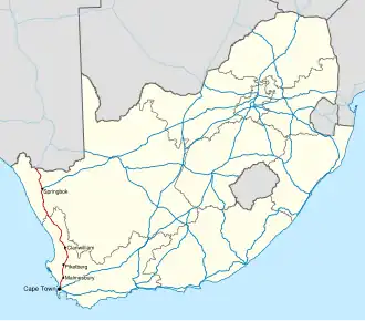 1. ^ a b c d Falkner, John (May 2012). South African Numbered Route Description and Destination Analysis (Report). National Department of Transport. pp. 20–21. Archived from the original on 6 June 2014. Retrieved 12 August 2014.
