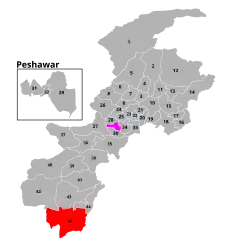 NA-45 Dera Ismail Khan-II (این اے-45، ڈیرہ اسماعیل خان-II) is a constituency for the National Assembly of Pakistan. The constituency was created in 2018 by bifurcating NA-25 (Dera Ismail Khan-cum-Tank) where Tank district shared its representation with a portion of Dera Ismail Khan District. In 2018, Tank District got its own constituency while the Dera Ismail Khan areas of the old constituency are now included in NA-39 (Dera Ismail Khan-II). In 2022 Constituency no is changed into NA-45 (Dera Ismail Khan-II)[2][3]