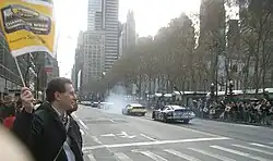 Cup Series cars, including Matt Kenseth's No. 17 and Rusty Wallace's No. 2, driving through Manhattan past Bryant Park during Champion's Week in 2005