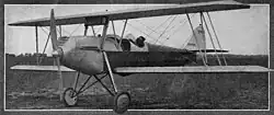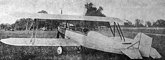 The fuselage was a fabric-covered, trussed steel tube structure with the readily available Curtiss OX-5 water-cooled V-8 under a rather pointed cowling in the nose. Its honeycomb radiator was mounted under the upper wing. There were two wide, open cockpits, each with a bench seat for two. The tail surfaces were very angular and constructed from dural, with a tailplane externally braced to the fin and fuselage. Its control surfaces were broad chord; the elevators had a deep cut-out for rudder movement.[1][2]