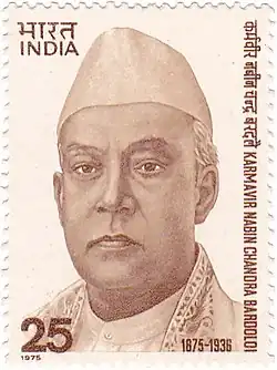 Nabin Chandra Bardoloi (1875–1936) was an Indian writer, politician and leader of Indian National Congress party from Assam.[1] An Indian independence movement activist, he was a prominent leader from Assam in the Non-cooperation movement (1920–1922) of Mahatma Gandhi.[2] He was conferred with Karmabir title for his works and contribution towards the people of Assam. The Government of India issued a commemorative postage stamp in his honour during his birth centenary year in 1975.[3] His daughter Nalini Bala Devi was a noted Assamese poet and writer, who also wrote his biography, Smritir Tirtha (1948).[4] He was the first General secretary of Assam Pradesh Congress Committee.
