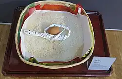 The cords of cloth that hang from the Naewat-dang deities are reminiscent of snakes, which are sacred patrons of wealth and a favored manifestation of village gods in Jeju religion.[69][29] The eyes of the gods are also serpentine, while there are ringed snakes or snake-like cords behind Cheonja's hat.[29] At the same time, there is also bird symbolism in the hands, in the goddesses' headpins, and in the red-beaked crow on Jeseok's staff.[64][70] This is unusual, as snakes and birds are incompatible in conventional Korean iconography.[64] The red-beaked crow may be linked to an episode in the Chasa bon-puri myth in which the god of death transforms into a bird and perches on a bamboo pole to escape the hero Gangnim.[27]