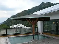 Rotenburo atop Hotel Park, with Mount Kinka in the background