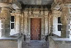 The highlight of the large hall are the bell shaped lathe turned pillars of dark grey stone (soap stone). So well polished are the pillars that they sparkle with reflected light. According to the Kamath, this is a standard characteristic of Western Chalukya pillar art, later to become popular with the Hoysala architects as well.[6] The main decoration on these pillars are the horizontal rings of moldings. There are other pillars on square bases whose shafts are octagonal or 16-sided with round capitals. The columns that stand between the two halls are extremely ornate and belong to an entirely different workmanship.[8] The ceiling in the large hall between pillars are highly decorative with designs such as rosettes with imaginary beasts (Kirtimukhas) at the four corners. Mention must be made of the central domed ceiling in the large hall which rises in concentric ornamental circles. The doorjamb and lintel decoration is worthy of mention, especially at the entrance to the closed hall from the south. The sanctum is now empty but would have at one time housed a linga, the universal image of the god Shiva. Though this temple has been called a Jain temple, according to Cousens, there is no trace of any images directly related to Jainism. On the contrary, there are numerous sculptures in relief of the Hindu gods such as Shiva, Vishnu, Ganapati, Brahma and Kali.[2]