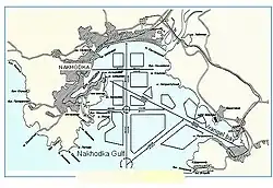 The first Russian settlement on the bay was established in 1906 and settled the following year. The village was named Amerikanka (Американка, Amerikánka) after the bay. Some initial arrivals refused to live in the settlement because they perceived its name as a reference to the United States.[8] A port was developed at Nakhodka in the 1950s, followed by Vostochny Port in the 1970s on the opposite side of the Gulf of America.[2] In 1972, the Russian Soviet Federative Socialist Republic reapplied the name Nakhodka Bay to the entire Gulf of America, eliminating a perceived reference to the United States, a geopolitical rival of the Soviet Union, as part of a broader renaming of geographical objects in the Russian Far East.[1] The smaller inlet is now known as Bukhta Nakhodka (бу́хта Нахо́дка).