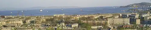 Nakhodka Bay or Nakhodka Gulf (Russian: зали́в Нахо́дка, romanizedzalív Nakhódka), historically called the Gulf of America[1] (зали́в Аме́рика, zalív Amérika), is a bay of the Peter the Great Gulf of the Sea of Japan where the port Nakhodka is located. It is part of the Primorsky Krai of Russia. The Lisy Island protects the bay from open sea waves.