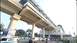 Nalban Metro Station is an elevated metro station and has a total of 3 levels.[46][47] Station entrances and exits begin or end at the first level or ground level.[48][49] Second-level or L1 or intermediate level houses station fare control, station agents, metro vending machines, crossovers, etc.[50] The third level or L2 or the final level houses the platforms and rail tracks. The station is 200 meters long and 25 meters wide.[16][32][51][17]