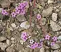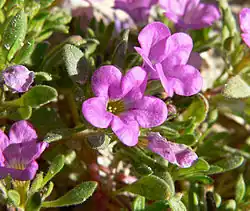 Purple mat, Nama demissum, grows in the American desert southwest, such as the Mojave Desert, and parts of Mexico on dry sandy or gravelly flats from 2000' to 5500' in creosote bush scrub.[1]