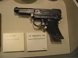The Type 94 Nambu 8 mm pistol (Type 94 handgun, in Japanese: 九四式拳銃, romanized: Kyūyon-Shiki Kenjū) is a semiautomatic pistol developed by Kijirō Nambu and his associates for the Imperial Japanese Army. Development of the Type 94 pistol began in 1929, and after several redesigns the final prototype was tested and officially adopted by the Japanese army in late 1934 (Japanese calendar, 2594).[1] The Type 94 pistol entered production in 1935. Approximately 71,000 pistols were manufactured before production ended in 1945.