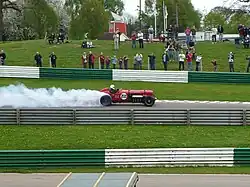 With its red bodywork and Napier-Railton-esque grille, it is spectacular and entertaining in action. Being a W12, the engine has three banks of four very large stub exhausts, one of which points straight out of the side of the car. The sound of the car has been likened to a World War I biplane or cluster or mortar bombs going off. Due to the immense torque of the engine (approx. 1,400 lb⋅ft (1,900 N⋅m)), the rear tyres can be made to produce clouds of smoke whenever the car is launched, while the exhausts produce sparks, flames and smoke.