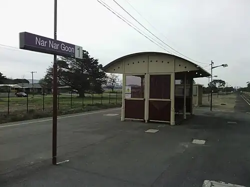 Nar Nar Goon railway station is a regional railway station on the Gippsland line, part of the Victorian railway network. It serves the town of Nar Nar Goon, in Victoria, Australia. Nar Nar Goon station is a ground level unstaffed station, featuring an island platform. It opened on 1 April 1881.[1][2]