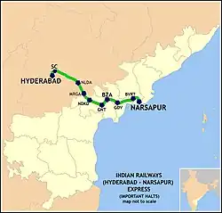 The train departs from Hyderabad at 21:45 hours and arrives in Narasapuram at 08:40 hours the next day. From Narasapuram, train departs at 18:55 hours and arrives in Hyderabad at 05:25 hours the next day. Train run with 6 air-conditioned coaches. The train operates daily and covers a distance of 461 km, via Gudivada, Vijayawada, Guntur, Nalgonda. This train is full entire year still South Central Railway (SCR) didn't provide more trains in this route. The Rake is shared by Narasapur–Nagarsol Express