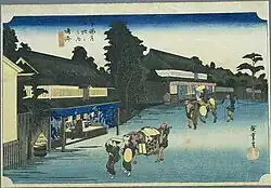 The classic ukiyo-e print by Andō Hiroshige (Hōeidō edition) from 1831 to 1834 depicts travellers passing by open-fronted shops selling tie-died cloth, typically used for making yukata summer kimono, which was a local speciality of the region.[2] The railroad bypassed Narumi-juku in the Meiji period, and a portion of the old town is preserved as a tourist attraction.