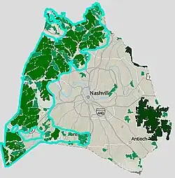 Delineation of NHRF was based on the U.S. Fish and Wildlife Service's (USFWS) Southeast Conservation Blueprint (SECAS Blueprint) database, used by multiple state, federal, and private organizations to rank and identify priority areas for conservation conservation throughout the southeast U.S. The Tennessee Wildlife Resources Agency (TWRA) collaborated with The Nature Conservancy and other partners to define the most prioritized conservation areas within the State of Tennessee, including the Western Highland Rim's forests, utilizing the SECAS Blueprint database and model.[11][12][13] Nashville includes a sizable portion of a large multi-county, conservation-priority area known as the Western Highland Rim Forests Conservation Opportunity Area (COA) identified by Tennessee in the TWRA 2015 State Wildlife Action Plan (SWAP).[12]