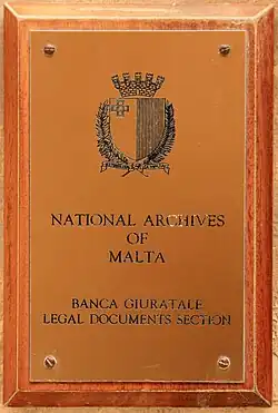 2. ^ a b c d "History of the National Archives of Malta". National Archives of Malta. Archived from the original on January 6, 2018. Retrieved January 26, 2011.